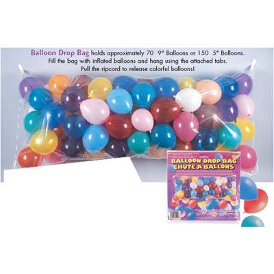 Bags: Balloons: Bows: Candles: Craft Supplies: Flowers artificial: Lighting: Mirrors: Balloon drop bag: Part Number Dropbag: Email a friend: $3.50. Quantity: Add Balloon drop bag. Bag w/ drawstring for dropping balloons from the ceiling. Holds approximately 72 - 7 inch balloons in an opaque plastic bag.